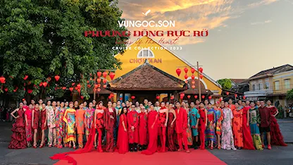 Bộ đôi nhà thiết kế VUNGOC&SON trình làng bộ sưu tập Cruise 2023 tại chợ Hội An gần 200 tuổi, với điểm nhấn "Cung đường Đèn Lồng Đỏ". Lấy sắc đỏ làm chủ đạo, bộ sưu tập "Phương Đông Rực Rỡ" gây ấn tượng với những gam đỏ đa dạng, không chỉ là đỏ thuần túy.